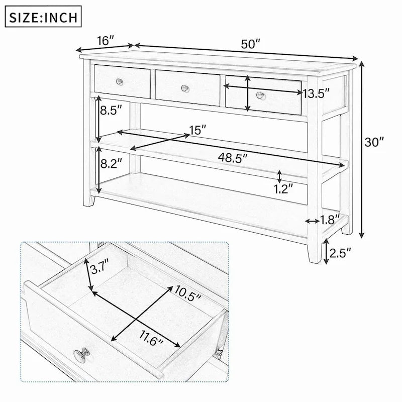 Upgrade your living space with this charming retro console table. Crafted with solid pine wood and MDF board, this table is built to last and features a smooth and elegant tabletop perfect for displaying your favorite decor items. With three spacious drawers and two open shelves, you can easily store and organize your essentials while keeping your home clean and tidy.