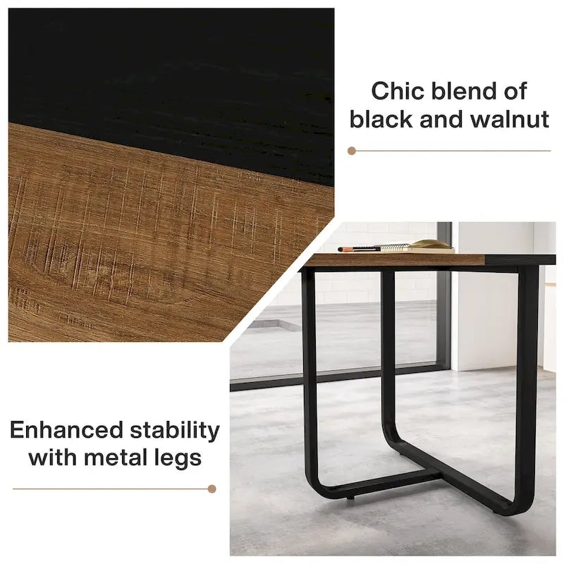 Upgrade your office space with this one-of-a-kind executive computer desk. With its curved design and novel style, this desk is not only functional but also adds a touch of sophistication to any professional setting. The tabletop features a striking walnut and black veneer splicing, crafted from durable engineered wood. Supported by uniquely designed heavy-duty metal legs, this desk ensures stability and longevity. Whether you need it as an executive computer desk or a double workstation, it offers ample space for all your work essentials. Achieve a contemporary look with this elegant desk, measuring 70.86W x 35.43D x 29.52H.