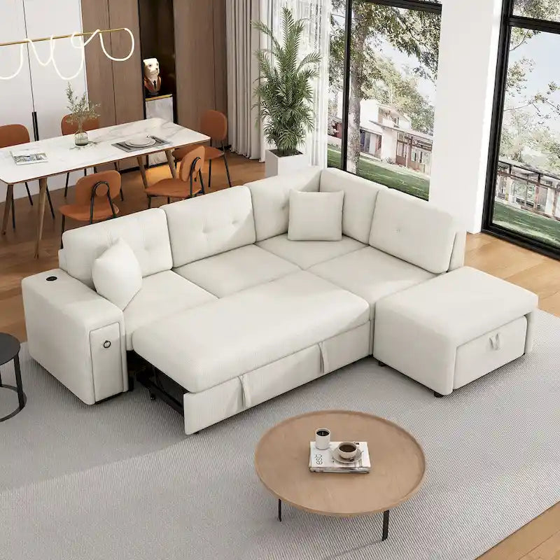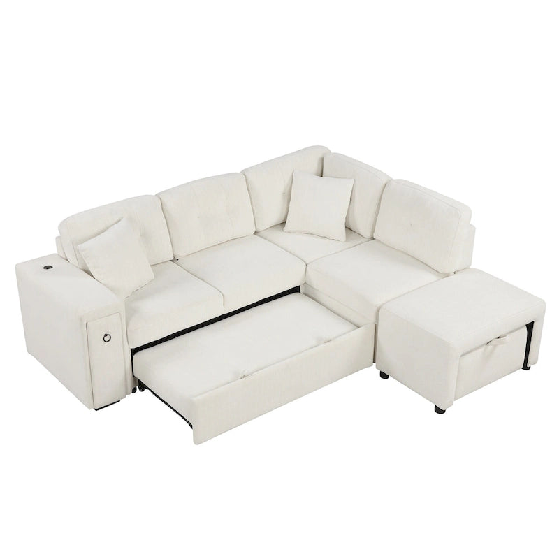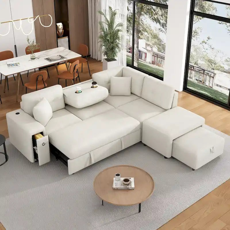 86.6 L-Shaped 4 Seater Sectional Sofa with Pull-Out Bed, Movable Ottoman, USB Ports, and Cup Holder Drop-Down Table