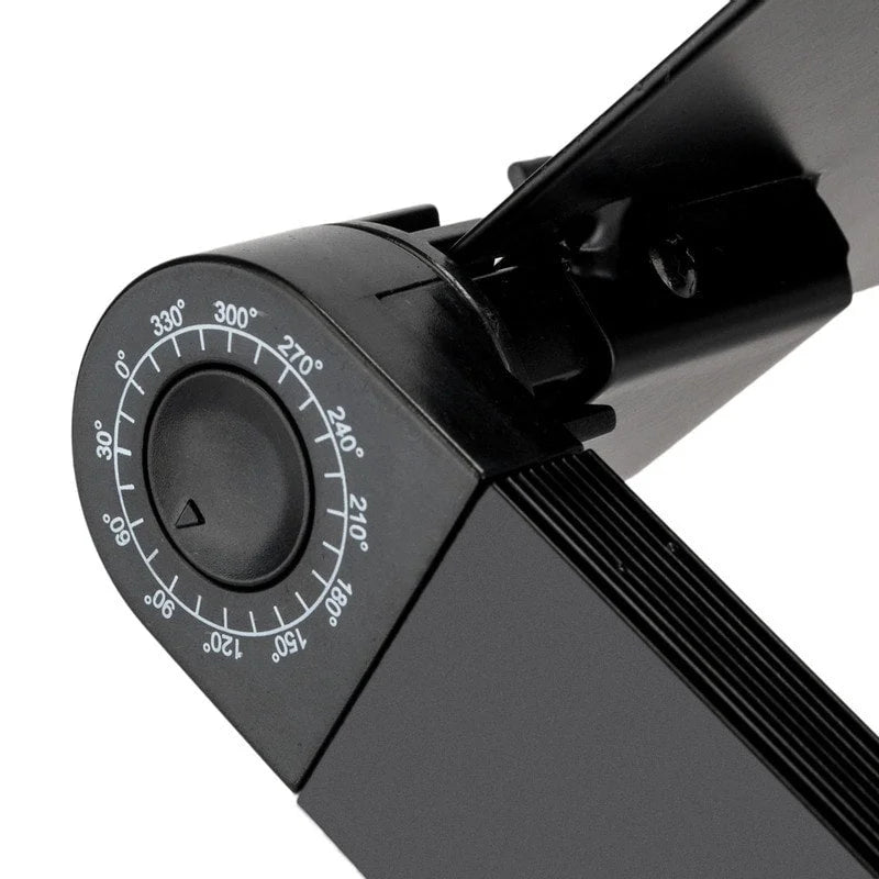 Introducing the Adjustable Folding Laptop Desk for Bed Couch with Fan & Mouse Pad, a versatile and portable solution for comfortable laptop use wherever you are. Made with durable aluminum alloy legs and ABS hard plastic knobs, this desk can be rotated 360 degrees and locked at various angles to provide the perfect typing position and alleviate neck and shoulder pressure. It even includes a fan to dissipate heat and extend the life of your electronics. Use it as a stand-up desk, breakfast tray, writing desk, and more. No assembly is required, and it comes with an easy-to-install mouse panel and anti-skid buckles.