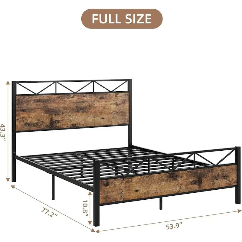 Vintage Queen Bed Frame - MDF board & black metal bed frame take an industrial look and rustic style. This retro queen size bed frame is a sleek finishing decoration to your bedroom, suitable for most bedroom stylesSturdy & Durable - Constructed with 9 metal legs and 14 heavy-duty steel slats, the weight capacity of this queen size bed frame can stand max up to 1000lbs. The Industrial wooden grain headboard and footboard provide better support to your mattressNoise Free - The non-slip thick square metal frame and sponge strips on the central support pole help minimize noise, helping you enjoy quiet and sweet dreamsMaximize Storage - With 11 inches of clearance underneath, our bed frame offers ample storage for various items and provides a neat solution for storing seldom-used belongingsHigh Quality Bed Frame - Combining safety, sturdiness, easy assembly, maximized storage, and noise-free design, offers the perfect combination of functionality and comfort for your bedroom. Experience a new level of comfort and practicality with our versatile bed frame