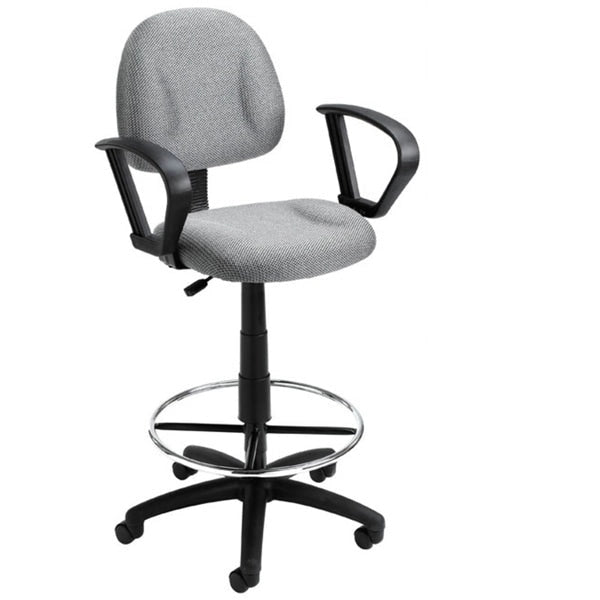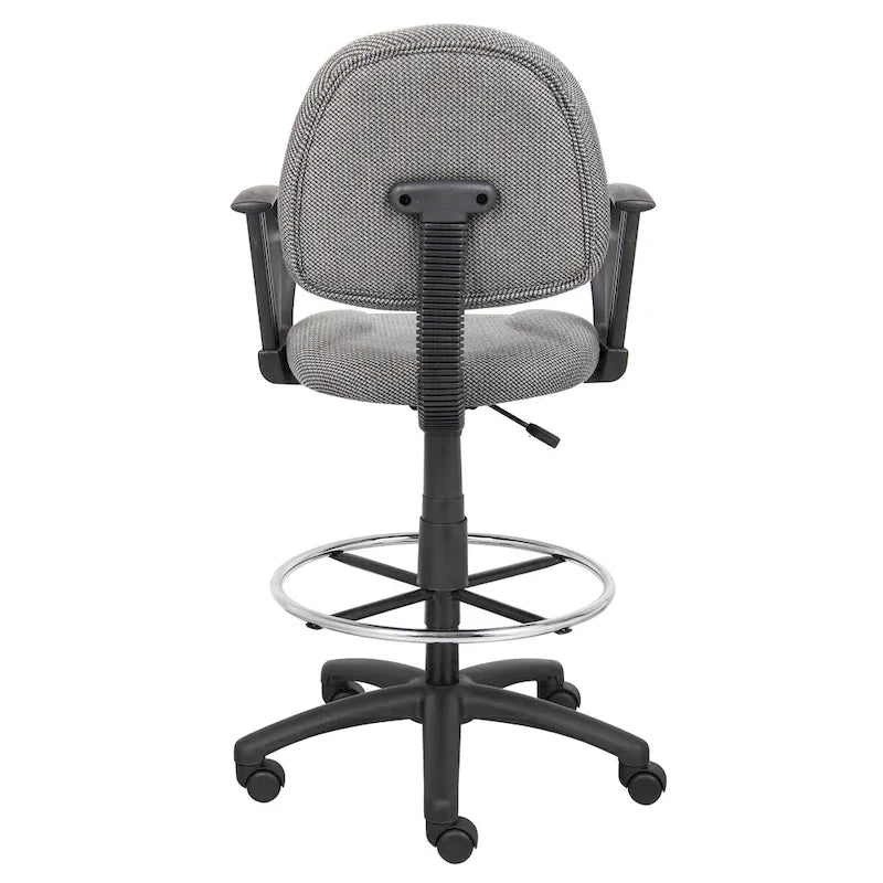 This tweed drafting stool comes with an easily adjustable pneumatic gas lift seat height adjustment, to help you find the personalized sitting style that suits you and your work environment. The contoured back and seat can help relieve back strain through extended periods of work. The 20-inch diameter chrome foot ring provides added foot and leg support. The Euro-style nylon base provides greater stability to the stool by spreading the load over a larger surface area, and the heavy duty dual wheel casters make it easy to move and shift directions. The Loop Arms make for comfortable and natural arm rests.