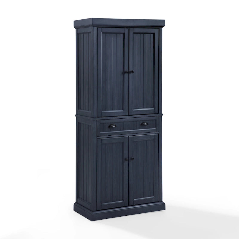 Add a touch of coastal charm to your home organization with the Seaside Pantry. With two spacious cabinets and an adjustable shelf, you'll have plenty of storage space for all your favorite essentials. The center drawer offers full extension and ample room for storage. This pantry features beautifully distressed beadboard paneling and metal hardware, making it the perfect addition to any room in your home.