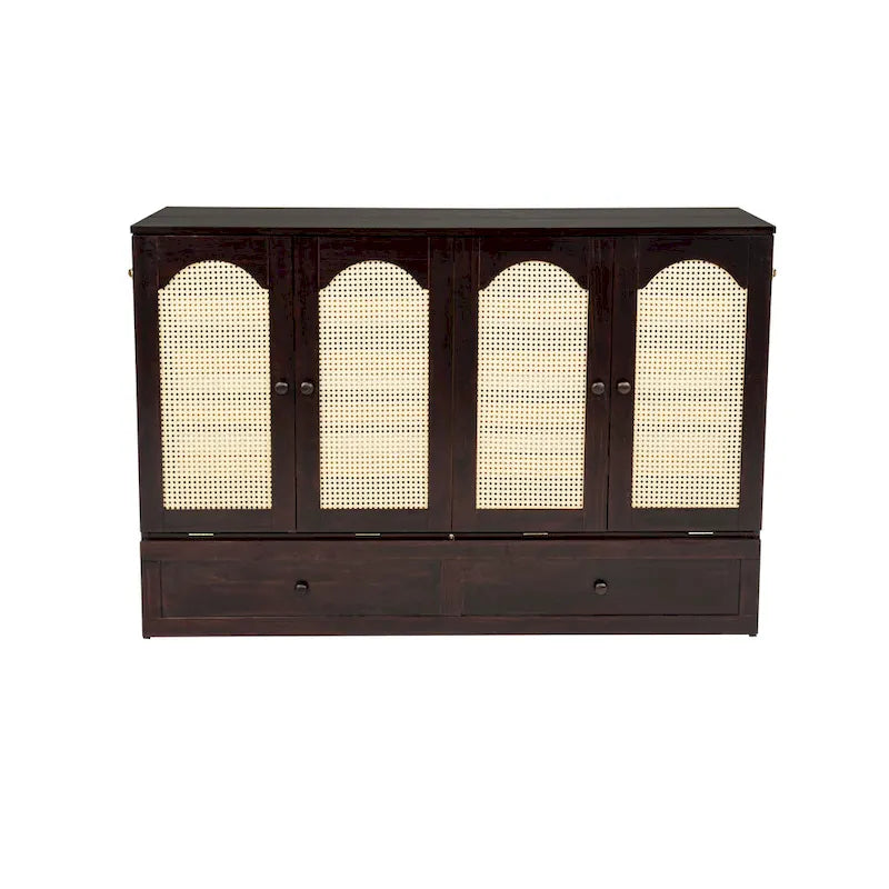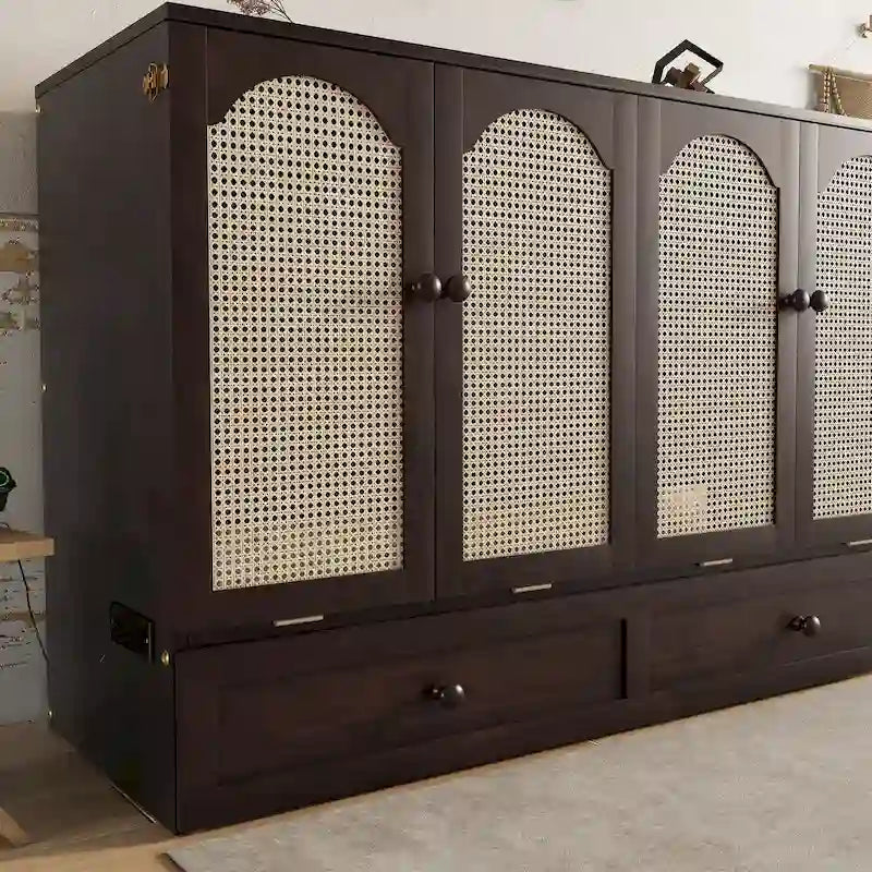 - This versatile cabinet bed ingeniously can be used conveniently as a multi-functional cabinet and a bed as well. Its effortlessly transformed into a comfortable sleeping space by nightfall, perfectly suited for accommodating overnight guests and fostering family gatherings, The distinctive rattan decoration panel of this cabinet bed harmoniously infuse your bedroom dcor with a vintage attraction and fostering a cozy yet fashionable ambiance. Moreover, the bed is an example of superior craftsmanship and long-lasting materials further elevating its overall aesthetic appeal