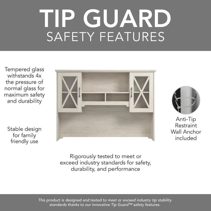 The Bush Furniture Lennox 60W Farmhouse Desk with Hutch and Storage Cabinet boasts a practical design to help you complete projects and assignments while conveying a natural, easy-going charm. Spread out with materials and equipment on a spacious 60 inch desk surface that supports up to 200 pounds and includes a built-in wire management grommet to keep cords and cables in order. A storage cabinet with a tempered glass door and X pattern accent keeps important materials and supplies close by while you work. The cabinet contains one adjustable shelf to accommodate items of various sizes. The Desk Hutch adds two more glass cabinets with adjustable shelves and a large open section that can be used to organize a small collection of books and reference materials or to give the room a personal touch with your favorite decorations. The style and versatility of this computer desk with hutch works well in a dedicated home office, but it can also be integrated flawlessly into a living room or any other residential space. The Lennox Collection's intentionally distressed finish and hardware reflect the best elements of coastal and farmhouse styling to fit perfectly in homes that embrace a more relaxed vibe. This home office desk with storage set has been meticulously tested to meet or exceed industry standards for safety, durability, and performance and is backed by the Bush Furniture 1 Year Manufacturer's Warranty. See the full Lennox Collection for coordinating items available.