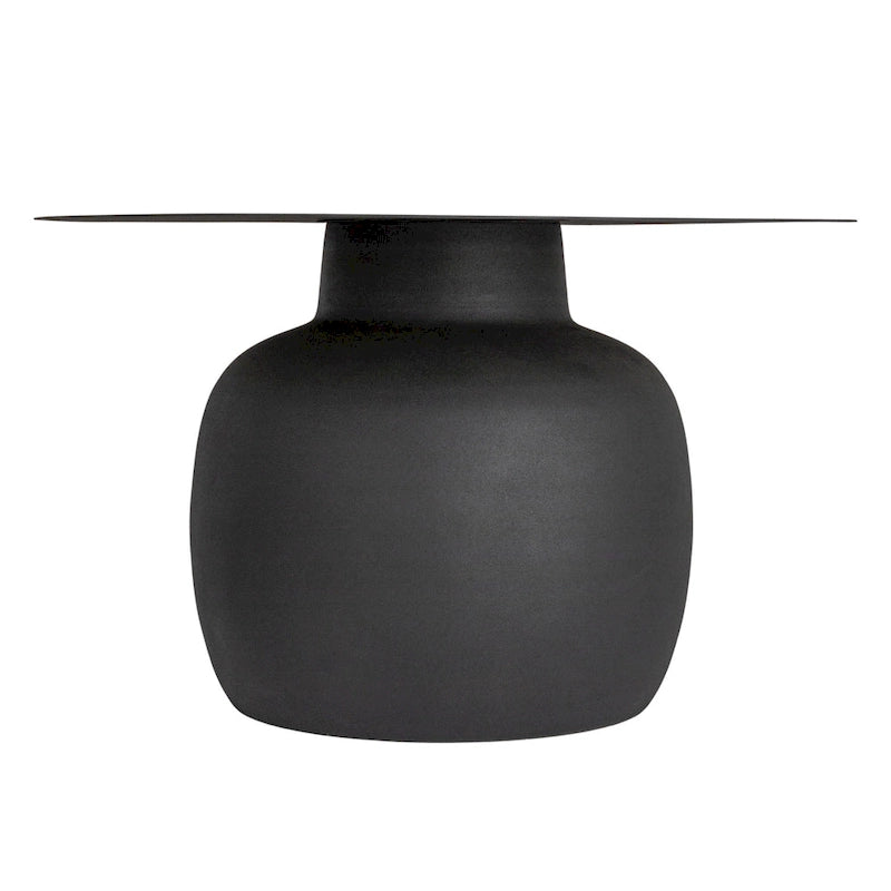 - A striking centerpiece, this coffee table showcases a sleek black metal finish with a round silhouette