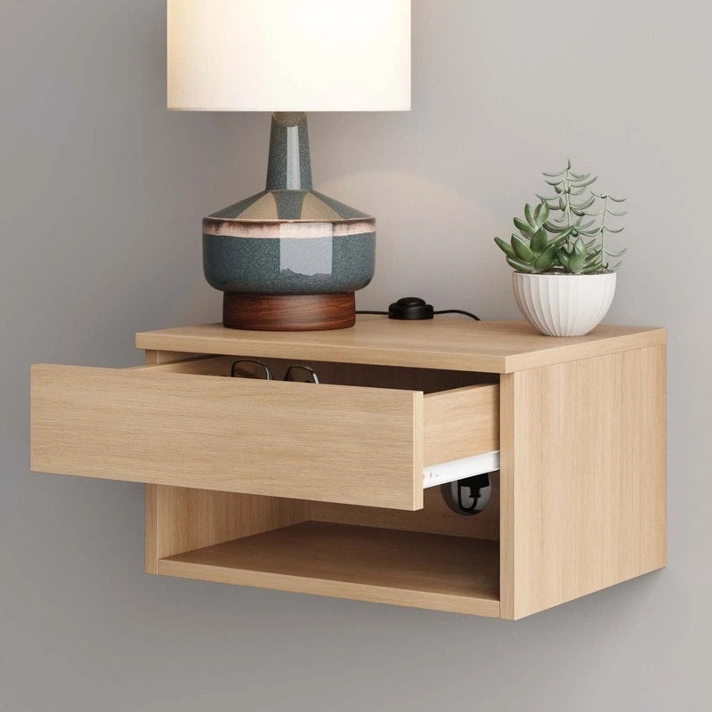 The dreamy floating design of works thanks to wall-anchored bolts provided for installation into drywall. The sturdy and solid structure supports up to 33 lbs on the tabletop and 11 lbs in the drawer. Who needs floor protector pads when your nightstand floats?