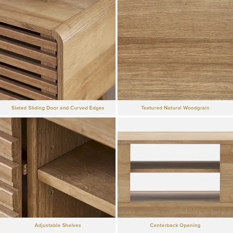 Upgrade your home entertainment setup with the Mopio Ensley 59 Mid-Century Modern TV Stand. Beautifully finished in Walnut Wood tone, this TV stand adds a touch of sophistication to any room. The smooth curved finishing and slatted door design make it stand out from other TV stands. The slatted door design allows seamless connectivity even with the doors closed. With ample surface space, it can accommodate most TVs up to 65 inches. The adjustable shelf and hidden storage behind two sliding doors provide generous storage for your media players and gaming consoles.