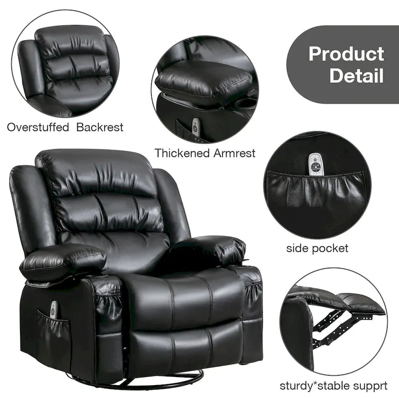 PU Swivel Rocker Massage Recliner Chair with USB Charge Port, 2 Cup Holders and Side Pocket