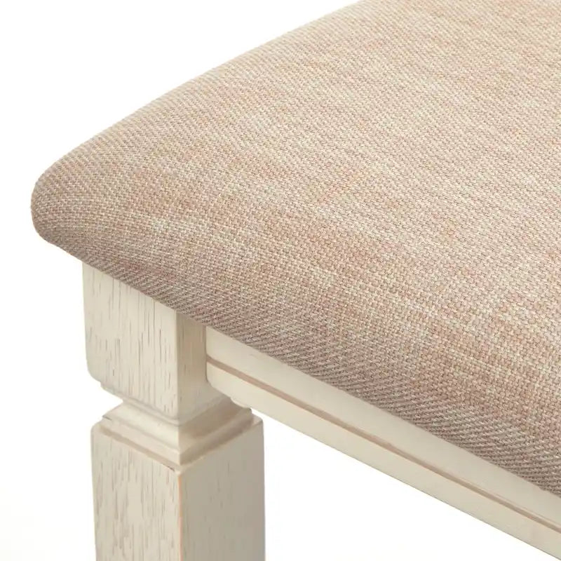 Create a more comfortable and elegant dining space with the Simple Living Maryland 5-pc Dining Set, perfect for modern-farmhouse interiors or transitional spaces. Beautiful two-tone table features two drop leaves that allow you to extend the table whenever you need more dining space. When not in use, the leaves drop down easily, saving space in your dining room or kitchen. Carved legs are crafted of solid rubberwood in a antique white finish. Tabletop is veneered MDF in a rich walnut finish. Chairs feature a timeless slat-back design and soft upholstered seats. Crafted of solid rubberwood with cushioned seats upholstered in a light grey, linen-like fabric.Set includes: One table and four chairs Modern farmhouse design with two-tone finish Table extends from 30 to 50 inches long with 2, 10-inch drop leaves Slat back chairs are comfortably padded Easy assembly Table top constructed of MDF with Veneer, legs are solid Rubberwood Walnut finished top with Antique White finish legs Chairs crafted of solid Rubberwood, Linen-like fabric and foam Antique White finish with Light Grey upholstry Ships in 3 cartons Table overall dimension: 30 inches high x 30-50 inches long x 36 inches deep Drop leaves (2) dimension: 10 inches long Chair overall dimensions: 39 inches high x 19.5 inches wide x 23.8 inches deep Seat dimensions: 19.25 inches high x 19.5 inches wide x 17.75 inches deep
