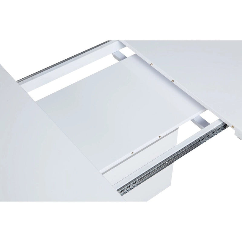 This beautiful contemporary dining set features an extendable dining table in white gloss finish that effortlessly opens from 32x 51 to 67 with a 16 Self-storing Extension. It features stainless steel accents and floor plate, matching the trapezoid-shaped legs of the nook, which is upholstered in quality faux leather. It features a thick backrest with a touch of tufted accents to add character and enhance the overall appearance.