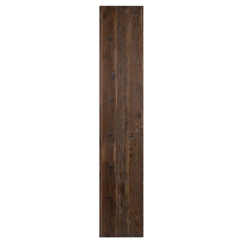 Solidly constructed of salvaged fir lumber with a carved trestle base. Sun faded and distressed patina is finished with a stony grey wash. Solid wood will continue to move with temperature and humidity changes, which can result in small cracks and uneven surfaces, adding to its authenticity and character.